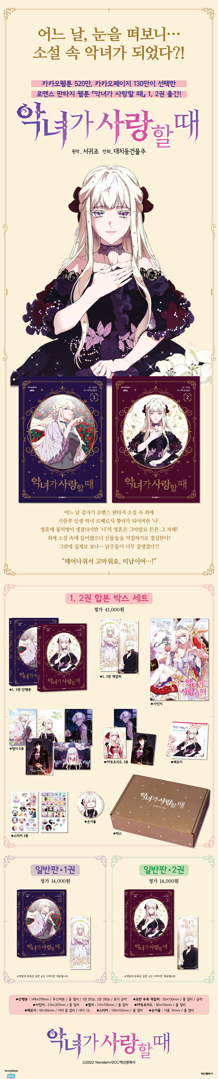 카카오웹툰 520만, 카카오페이지 130만이 선택한 로맨스 판타지 웹툰『악녀가 사랑할 때』 단행본 발행!2020년 9월부터 카카오페이지에서 연재 중인 웹소설 원작 웹툰「악녀가 사랑할 때」가 드디어 단행본으로 발행된다.