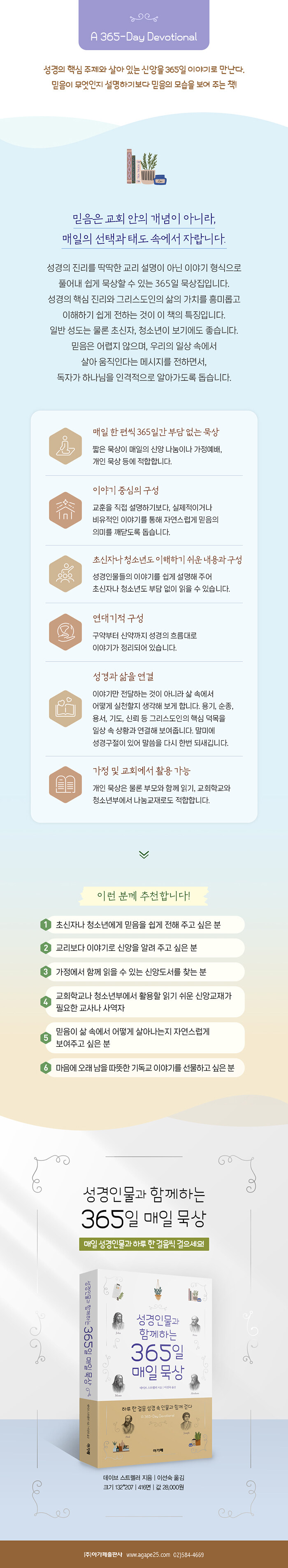 성경의 진리를 딱딱한 교리 설명이 아닌 이야기 형식으로 풀어내 쉽게 묵상할 수 있는 365일 묵상집이다.
