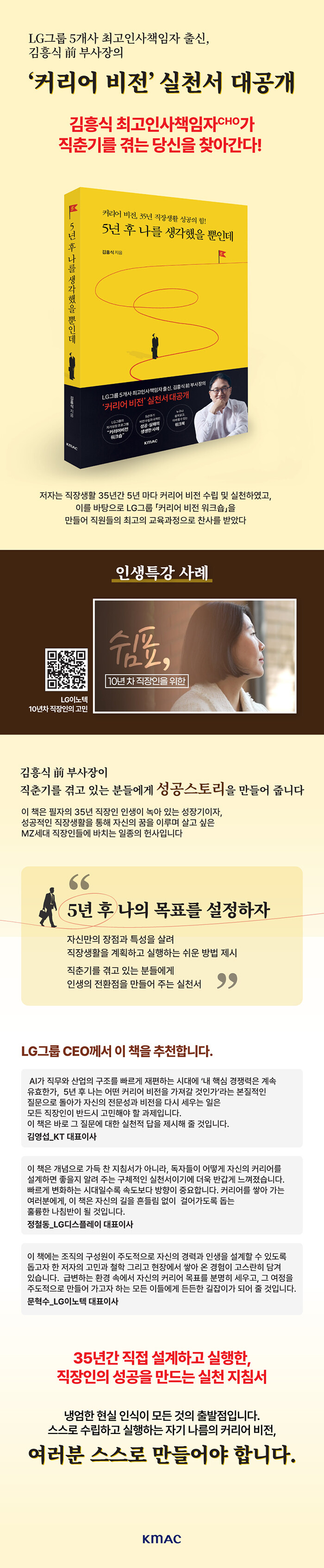 <커리어 비전 워크숍>, 그 원형인 ‘커리어 비전 방법론’ 대공개!LG그룹에서 35년 넘게 마케터이자 인사책임자로 일하며 (주)LG는 물론 5개 주요 계열사의 최고인사책임자(CHO)를 거쳐 2025년 3월 정년퇴임한 김흥식 전 부사장. 이 백전노장의 뜻깊은 첫 저작, 『5년 후 나를 생각했을 뿐인데』를 펴냈다. 이 책은 ‘김흥식’이라는 한 직장인의 5년 주기 커리어 비전 수립 및 실행 프로젝트가 어떻게 ‘LG’라는 한 대기업의 직원 성장 지원 프로그램으로 확장해 자리매김하게 되었는지 그 연원을 밝히면서 ‘커리어 비전(Career Vision)’의 개념, 이론적 근거와 구체적 실천법을 집대성한 비전 설계 실천서이다. 직장인으로 입사한 이후 정년퇴임까지 살아온 삶의 궤적과 퇴임 이후까지 갖는 자신의 성장 서사를 진솔하게 들려주면서 대한민국 직장인들에게 시의적절한 노하우를 전수하고 그들의 인생을 진심으로 성원하는 필치가 돋보인다.
