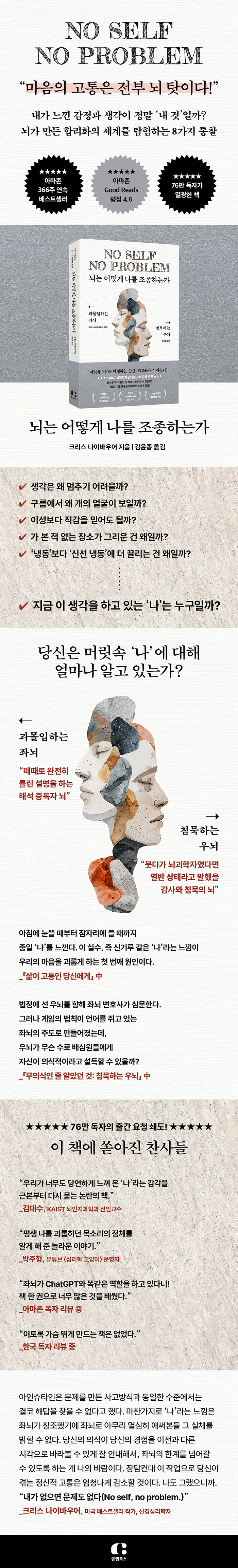 미국의 베스트셀러 작가이자 신경심리학자 크리스 나이바우어 박사는 2500년 전 선불교에서 다뤄 온 무아(無我) 사상이 현대 신경과학의 수많은 실험 결과와 놀라울 정도로 유사하다는 점을 발견한다. 신경심리학자로서 22년간 좌우뇌의 작동 원리를 연구하고, 수행자로서 동양의 영적 가르침을 몸소 실천한 그의 실험적 행보는 의미를 과잉 생산하고 자신의 존재 가치를 의심하는 현대인들에게 욕망의 덧없음을 일깨우는 동시에 ‘나’를 바라보는 신선한 관점을 제안한다. 핵심은 다음과 같다. 도달할 수 없는 ‘이상적인 나’를 끊임없이 갱신하는 좌뇌와의 동일시를 멈추고 감사와 연민으로 가득한 우뇌 의식을 깨움으로써 삶의 균형을 맞춰 가는 것. 출간 직후부터 약 7년이 지난 지금까지 아마존 신경심리학 분야의 베스트셀러로 자리매김하며 전 세계 독자의 ‘인생 책’으로 호명되고 있다.