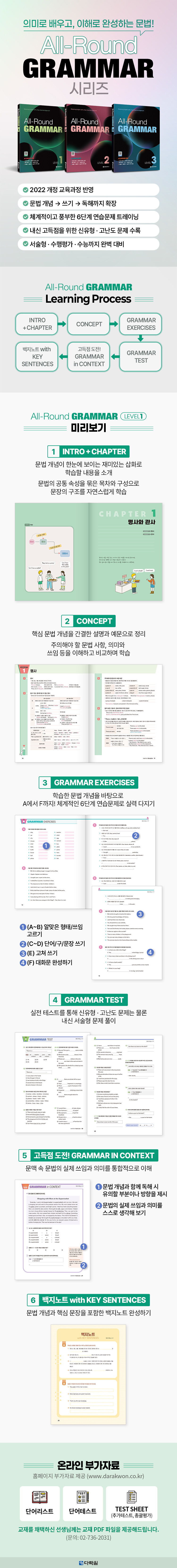 <All-Round GRAMMAR 시리즈>는 문법 개념에서 쓰기와 독해까지, 체계적인 6단계 연습문제 트레이닝으로 서술형 · 수행평가 · 수능까지 대비할 수 있는 올라운드 문법 교재입니다.