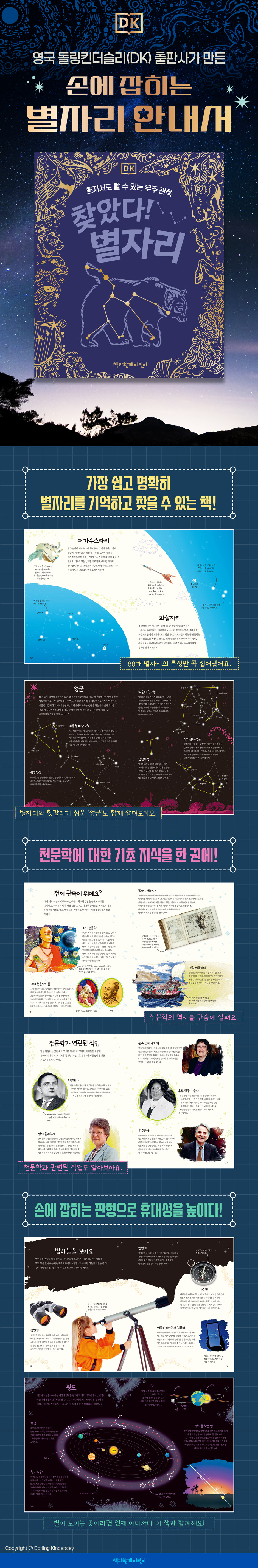 맨눈으로 별자리를 쉽게 찾는 방법을 알려 주는 핸드북. 국제 천문 연맹(IAU)에서 인정하는 88개 별자리를 모두 아우른다. 어린이 과학 분야 베스트셀러 ‘DK 100가지 사진으로 보는 신비’ 시리즈의 소형판으로, 휴대성을 높이면서도 눈길을 사로잡는 이미지에 금빛 테두리로 고급스러움을 놓치지 않았다.