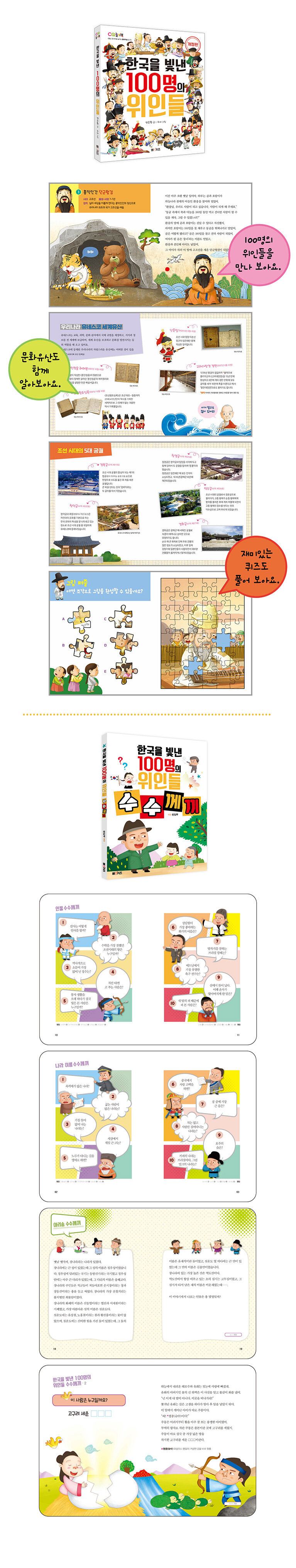《 한국을 빛낸 100명의 위인들 수수께끼 》이 책은 각 주제별로 분류된 수수께끼를 풀어보면서 유머와 상식을 키울 수 있습니다. 단순한 단답식 수수께끼 및 논술형 수수께끼까지 다양한 수수께끼가 어휘력을 향상시키는 데에 도움을 줍니다. 또한 각 챕터 마다 구성된 한국의 위인들에 대한 수수께끼는 어렵게 느끼던 위인들에 대해 재미있게 공부하며 익힐 수 있습니다.