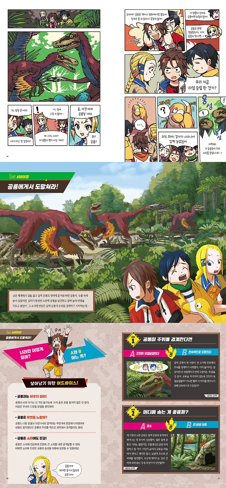 백악기 환경을 탐색하다가 언덕에 도착한 상황, 언덕에서 익룡의 공격을 받았다면 어떻게 대처하는 것이 좋을까? ‘A. 바다에 뛰어든다 VS B. 바위 틈에 숨는다’, 살아남기 위해 먹을 것을 찾아다니던 중, 서로 싸우다 죽은 것처럼 보이는 육식 공룡과 초식 공룡을 발견했다면? 어떤 공룡의 고기를 먹는 게 좋을까? ‘A. 초식 공룡의 고기 VS B. 육식 공룡의 고기’. 이렇듯 『눈떠 보니 백악기?』는 아이들에게 친숙한 게임 요소를 접목해 위기 상황을 지혜롭게 풀어나가는 생생한 경험을 선사한다.