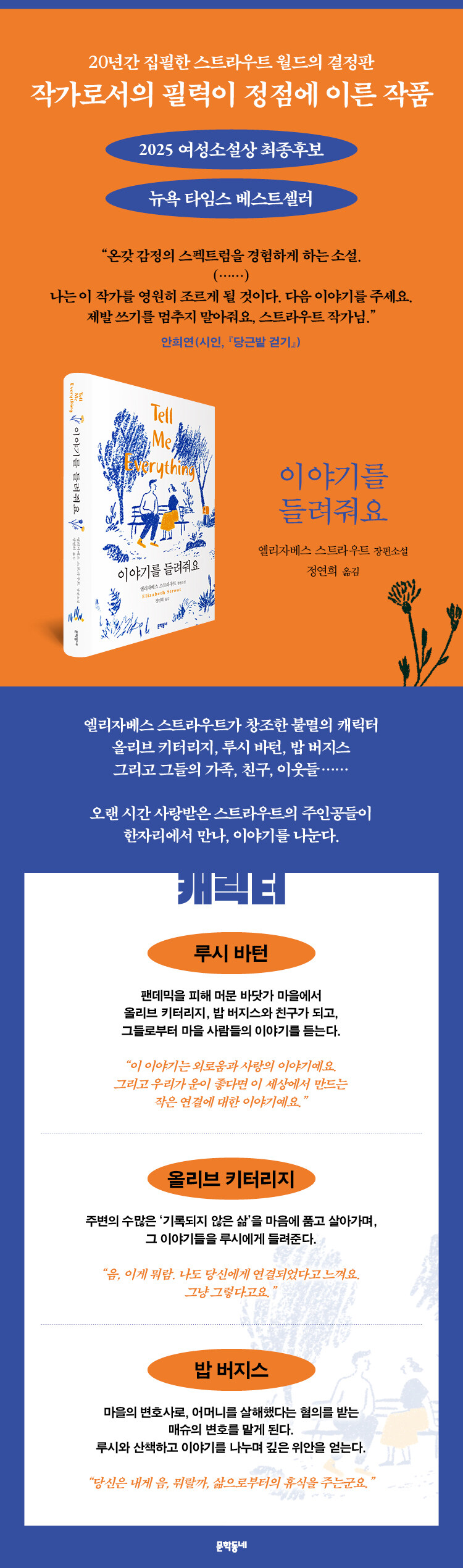 뉴욕 타임스 베스트셀러 | <타임> <보그> <퍼레이드>, NPR 선정 올해의 책 다채로운 삶의 면면을 일상적인 언어로 통렬하게 그려내는 작가 엘리자베스 스트라우트의 신작 『이야기를 들려줘요』가 문학동네에서 출간되었다. 이번 작품은 『올리브 키터리지』의 올리브, 『내 이름은 루시 바턴』의 루시, 『버지스 형제』의 밥, 『에이미와 이저벨』의 이저벨 등 스트라우트가 20년간 집필한 작품 속 주요인물이 모두 등장하는 세계관의 결정체와 같은 장편소설이다. 스트라우트는 이 작품으로 “필력이 최고조에 이르렀다”는 평과 함께 2025년 여성소설상 최종후보에 올랐다.