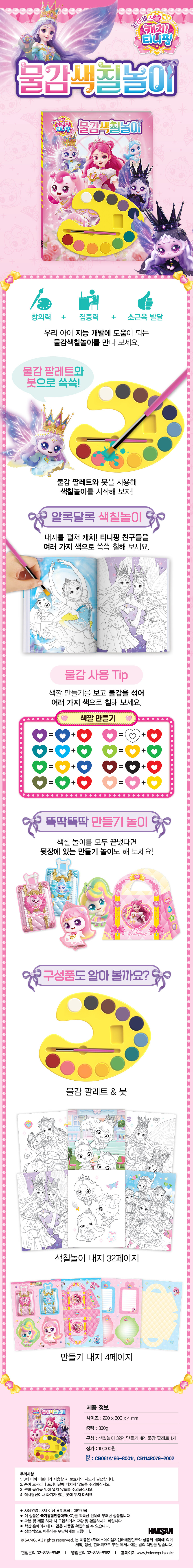 12가지 물감으로 여러 가지 색을 만들어 색깔 익히기를 통해 미술적 감각을 기를 수 있다. 아이가 좋아하는 캐릭터를 칠하다 보면 집중력과 주의력을 높여주며 동시에 창의력과 색채 감각이 향상된다. 물감 색칠놀이는 만들기 2장이 들어 있어 가위로 오리고 만드는 활동을 통해 큰 재미를 느낄 수 있다.