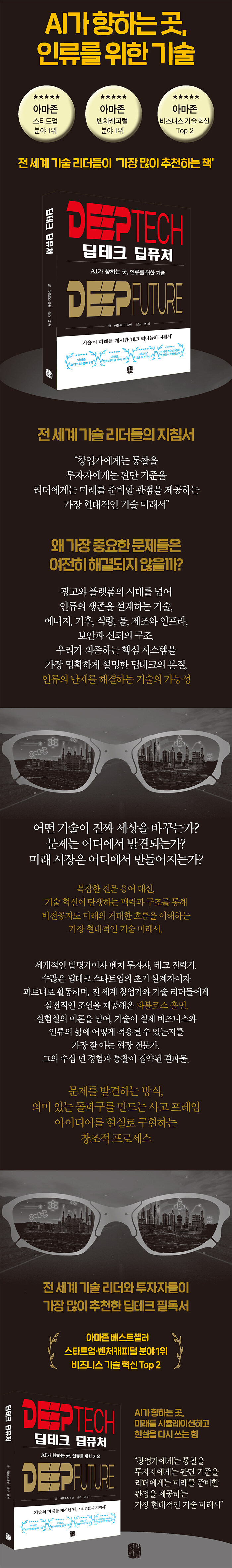 그 결과 『딥테크 딥퓨처』는 출간 직후 아마존 스타트업·벤처캐피털 분야 1위, 비즈니스 기술 혁신 Top 2를 기록하며, 전 세계 창업가·투자자·기술 리더들이 가장 많이 추천하는 딥테크 필독서로 자리 잡았다.