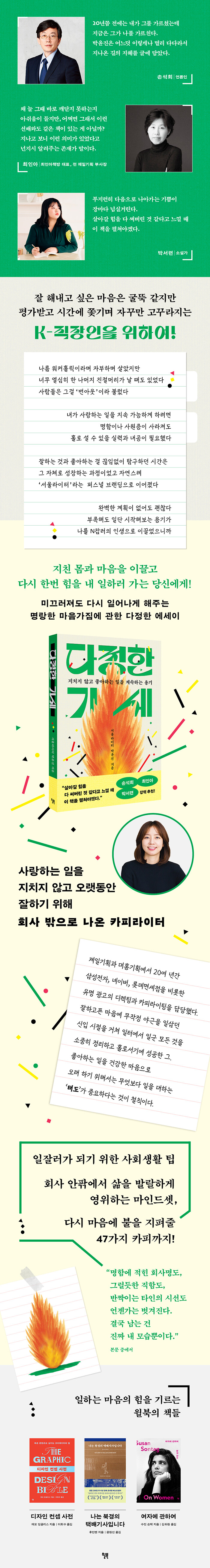 저자가 가장 강조하는 건 일과 일상을 대하는 ‘다정한’ 마음가짐이다. 일하는 동안 고난을 여럿 통과하다 보면 냉소적이고 관성적으로 변해버리기 십상이지만, 매사에 긍정적으로 시도하고 보는 다정한 마음이야말로 지치지 않고 오랫동안 일을 해나갈 수 있는 원동력이기 때문이다. 그러기 위해선 생활인으로서의 면모도 충실히 가꿔야 한다. 저자 또한 일상에서 틈틈이 소소한 취미와 휴식을 즐기고, 나만의 취향을 계속해서 발견해 사적인 세계를 보듬어가며 더 나은 내가 되기를 꿈꾼다.