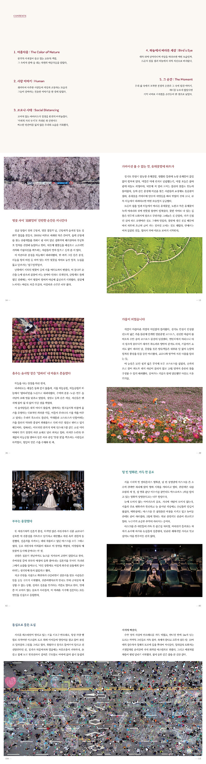 자연의 색, 사람들의 삶, 코로나 시대의 일상, 드론으로 포착한 하늘의 시선, 그리고 찰나의 순간까지 다섯 개의 장으로 구성했다. 해남 땅끝마을까지 이어진 긴 이동과 새로운 촬영 방식이 만들어낸 256컷의 사진은, 우리가 익숙하게 지나쳐 온 현실을 다른 각도에서 다시 보게 한다. 기록과 감상의 경계에서 사진이 지닌 또 하나의 가능성을 보여준다.