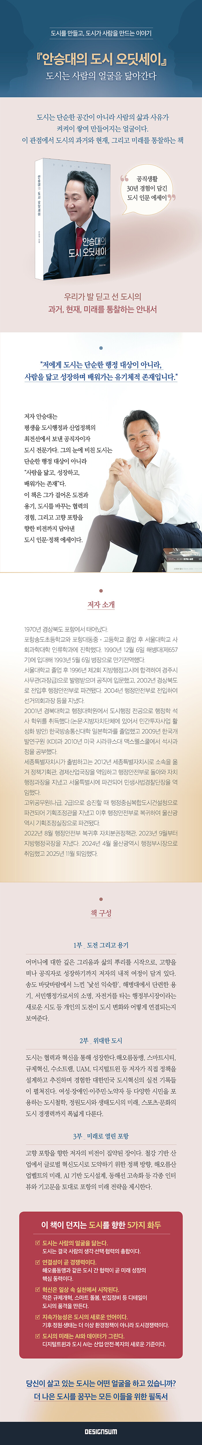 저자 안승대는 평생을 도시행정과 산업정책의 최전선에서 보낸 공직자이자 도시 전문가다. 그의 눈에 비친 도시는 단순한 행정 대상이 아니라 “사람을 닮고, 성장하고, 배워가는 존재”다. 이 책은 그가 걸어온 도전과 용기, 도시를 바꾸는 협력의 경험, 그리고 고향 포항을 향한 비전까지 담아낸 도시 인문·정책 에세이다.