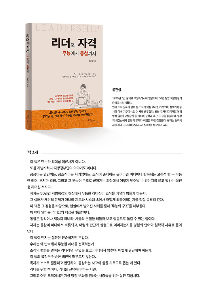 무능의 고발에 머물지 않고 통찰의 리더십으로 나아가는 길을 제시한다. 지식의 무장, 조직 언어의 해석, 사람을 보는 눈, 정치력의 실천까지 다섯 원리를 통해 리더의 내면과 사고를 재구성한다. 공공과 민간을 넘어 변화를 고민하는 모든 조직을 향한 사유의 텍스트다.