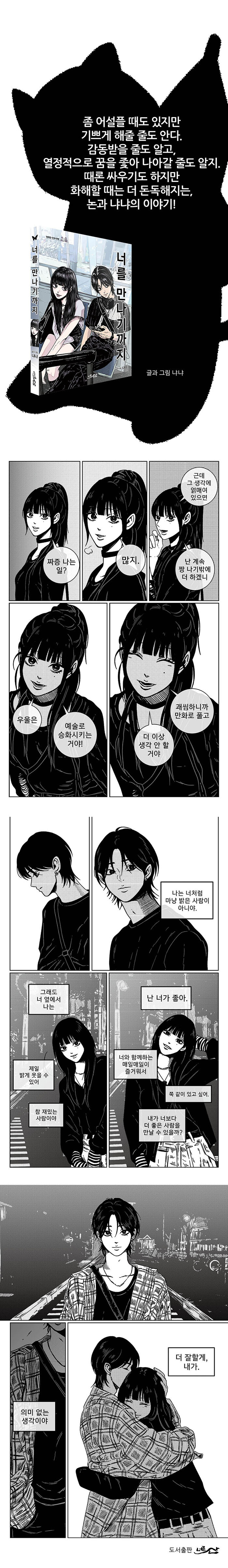사랑을 표현하려 했던 내 행동들은 얼핏 보면, 너에게 잘해주려는 것처럼 보이지만사실은 그냥 내가 하고 싶어서 내가 보고 싶어서 한 행동들이었어.‘행복한 만화책방’ 시리즈 아홉 번째 단행본으로 인스타툰 작가 ‘냐냐’의 작품 《너를 만나기까지》를 펴냈다. 인스타그램에서 흑백 툰으로 꾸준히 작품활동을 펼치고 있는 2.3만 팔로워 냐냐의 일상을 그린 작품이다. 깔끔한 선 처리와 스크린톤을 활용하여 남녀 주인공의 풍부한 감정 표현이 눈길을 사로잡는다. 사랑에 대한 현실적인 감정들, 서툴렀던 연애 방식의 변화를 거쳐 미숙했던 두 사람이 지금 서로를 만나기까지, 현재 진행 중인 달달한 그들의 사랑 이야기에 누구나 한 번쯤 그때 그 순간을 떠올릴 법하다.
