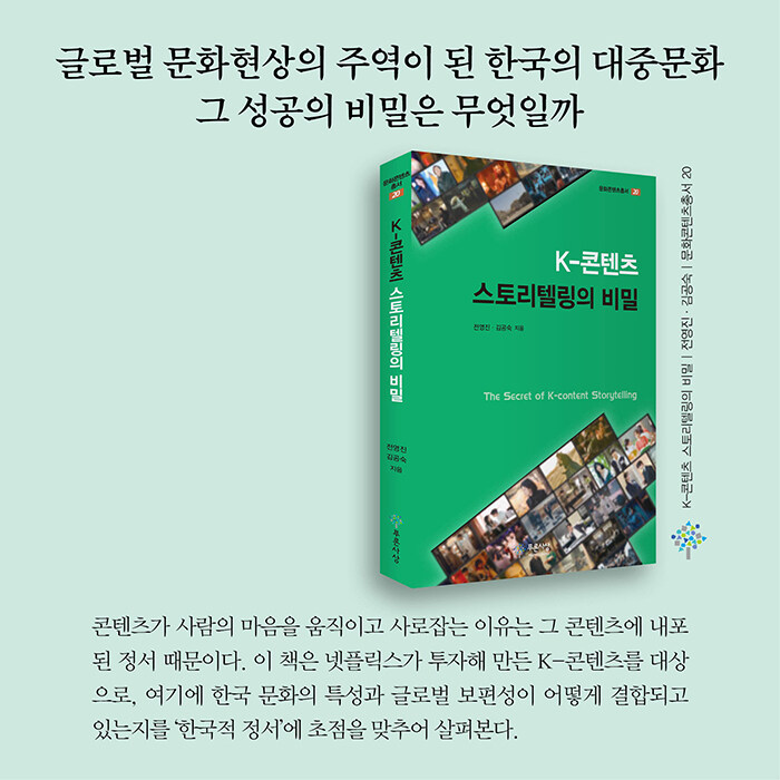 다수의 K-콘텐츠 관련 선행연구가 한국적 정서를 언급하곤 했다. 그러나 스토리텔링에 어떻게 구체적으로 한국적 정서가 드러나는지 체계적이고 심층적인 탐색은 부족했다. 그래서 이 책이 나왔다.