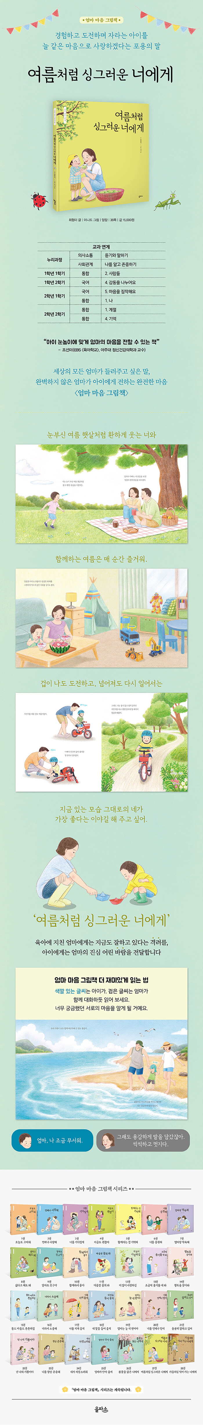 뜨거운 여름처럼 정열적인 아이에게 전하는 엄마의 마음엄마가 아이에게 전하고 싶은 마음을 담은 《엄마 마음 그림책》 시리즈 스물일곱 번째 권 《여름처럼 싱그러운 너에게》가 출간되었습니다. 《여름처럼 싱그러운 너에게》는 아이가 있는 힘껏 도전하고 노력하는 모습을 여름 햇살에 비유하며, 뜨거운 여름만큼 신나게 지내길 바라는 엄마의 마음을 담았습니다.