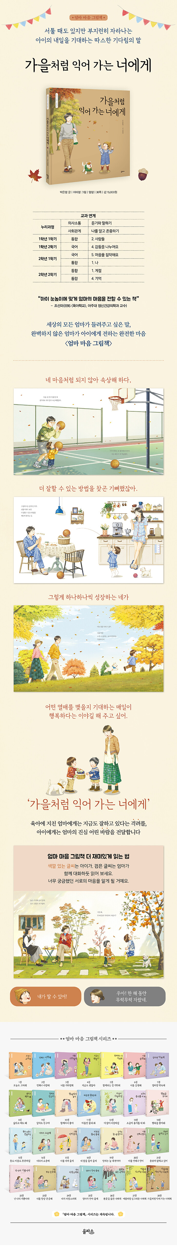 열매처럼 예쁘고 단단하게 익어 가는 아이에게 전하는 엄마의 마음 엄마가 아이에게 전하고 싶은 마음을 담은 《엄마 마음 그림책》 시리즈 스물여덟 번째 권 《가을처럼 익어 가는 너에게》가 출간되었습니다. 《가을처럼 익어 가는 너에게》는 예쁘고 단단하게 익어 가는 가을 열매처럼 아이가 어떤 열매를 맺을지 기대하며 아이의 성장을 뿌듯한 마음으로 지켜보는 엄마의 마음을 담았습니다.