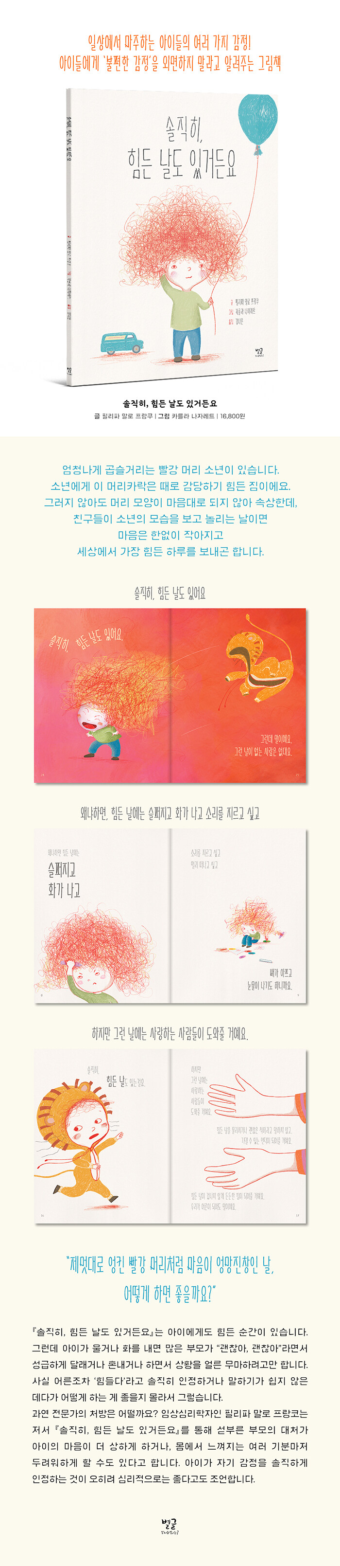 임상심리학자가 전하는, 우리 아이의 ‘나쁜 기분’을 다독이는 따뜻한 처방전!『솔직히, 힘든 날도 있거든요』의 주인공은 엄청나게 곱슬거리는 빨강 머리 소년입니다. 소년은 머리 모양이 마음대로 되지 않아 속상합니다. 그런 데다가 친구들이 놀리기까지 합니다. 이럴 때면 마음은 한없이 작아지고 세상에서 가장 힘든 하루를 보내곤 합니다.
