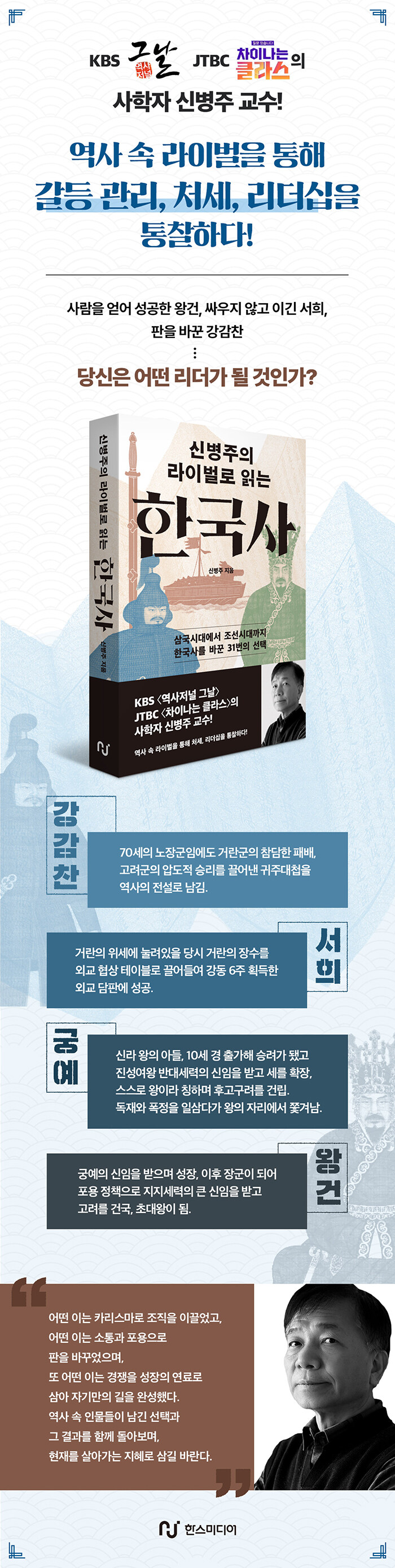 타고난 이야기꾼이자 대중 역사학자로 사랑받아 온 신병주 교수의 해설은 복잡한 역사적 맥락을 쉽고 흥미롭게 풀어낸다. 책을 따라가다 보면 독자는 자연스럽게 질문에 이르게 된다. 나라와 조직, 그리고 개인의 운명을 가르는 결정적 순간에 나는 어떤 선택을 할 것인가.