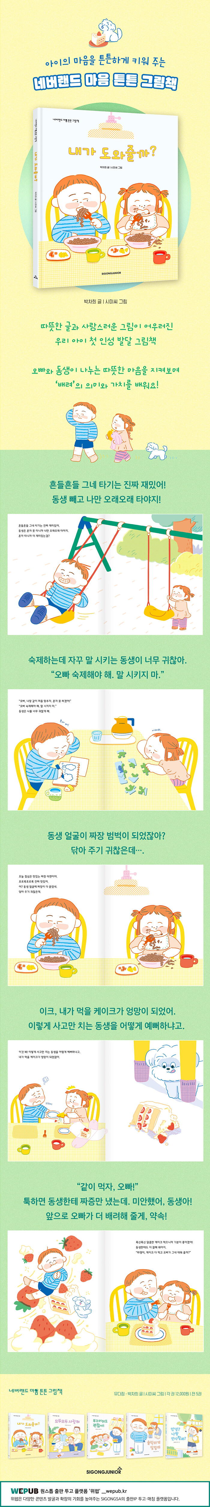 <네버랜드 마음 튼튼 그림책> 시리즈는 4~6세 아이들이 일상에서 마주하는 감정과 상황을 따뜻한 이야기로 풀어낸 인성 발달 그림책으로, 총 5권으로 구성되어 있다. 그중 《내가 도와줄까?》는 남매 사이에서 겪는 작은 갈등과 화해를 통해 ‘배려는 상대의 마음을 이해하려는 태도에서 시작된다’는 메시지를 전한다.