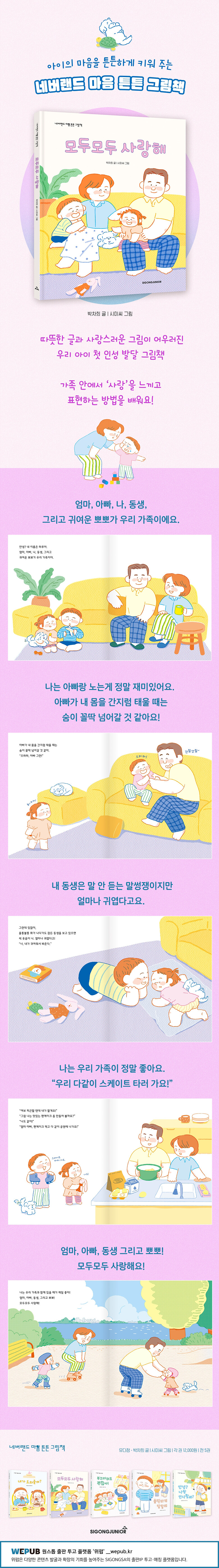 * 따뜻한 글과 사랑스러운 그림이 어우러진 우리 아이 첫 인성 발달 그림책 * 가족 안에서 사랑을 느끼고 표현하는 방법을 배워요!<네버랜드 마음 튼튼 그림책> 시리즈는 4-6세 아이들이 일상에서 마주하는 감정과 상황을 따뜻하고 자연스러운 이야기로 풀어낸 인성 발달 그림책으로, 총 5권으로 구성되어 있다. 그중 《모두모두 사랑해》는 가족이라는 가장 친밀한 관계 속에서 ‘사랑이란 서로를 아끼고 소중히 여기는 마음’임을 아이가 스스로 깨닫도록 돕는 작품이다.