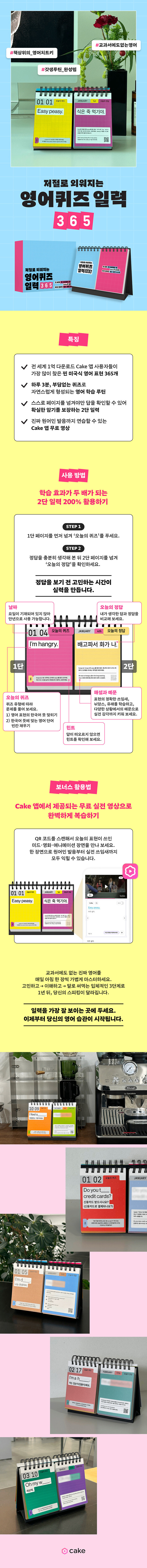 전 세계 1억 다운로드 영어 학습 앱 Cake 사용자들이 선택한 ‘진짜로 유용한 영어 표현’만을 모은 일력이다. 교과서에서 보던 딱딱한 표현이 아니라 원어민들이 카페, 회사, 온라인 등 실생활에서 매일 쓰는 리얼 영어 표현 365개로 구성되어 있다.