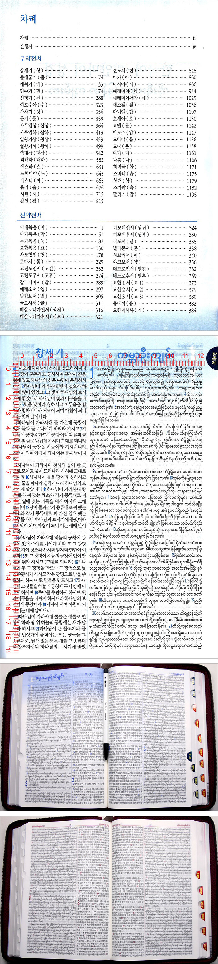 한국어(개역한글판) 미얀마어 대조성경. 본서의 한글성경 본문은 대한성서공회 발행 [성경전서 개역한글판]을 사용하였고, 미얀마어(버마어) 성경 본문은 [Judson (1835)]를 사용하였다.