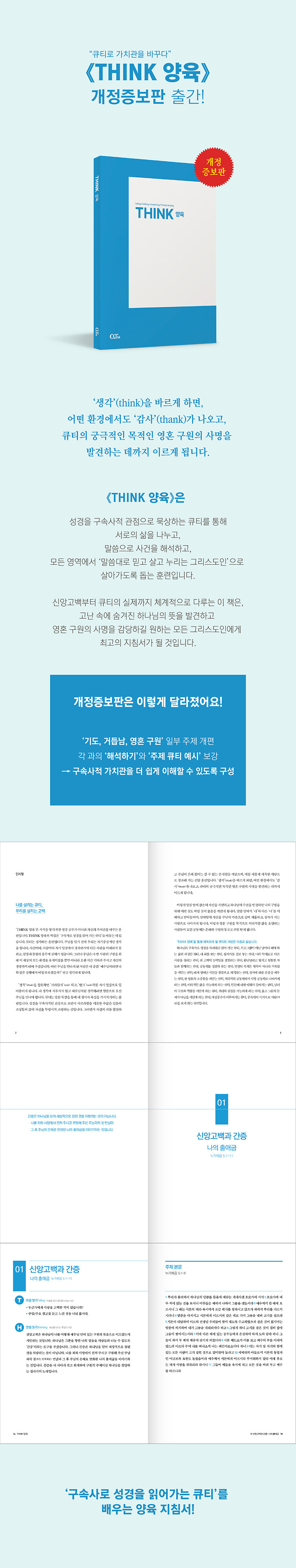 QTM(대표 김양재 목사)에서 청장년을 위한 양육 지침서 《THINK 양육》 개정증보판을 출간했습니다. ‘THINK 양육’은 성경을 구속사적 관점으로 묵상하는 큐티를 통해 서로의 삶을 나누고, 말씀으로 사건을 해석하고, 모든 영역에서 ‘말씀대로 믿고 살고 누리는 그리스도인’으로 살아가도록 돕는 훈련입니다.
