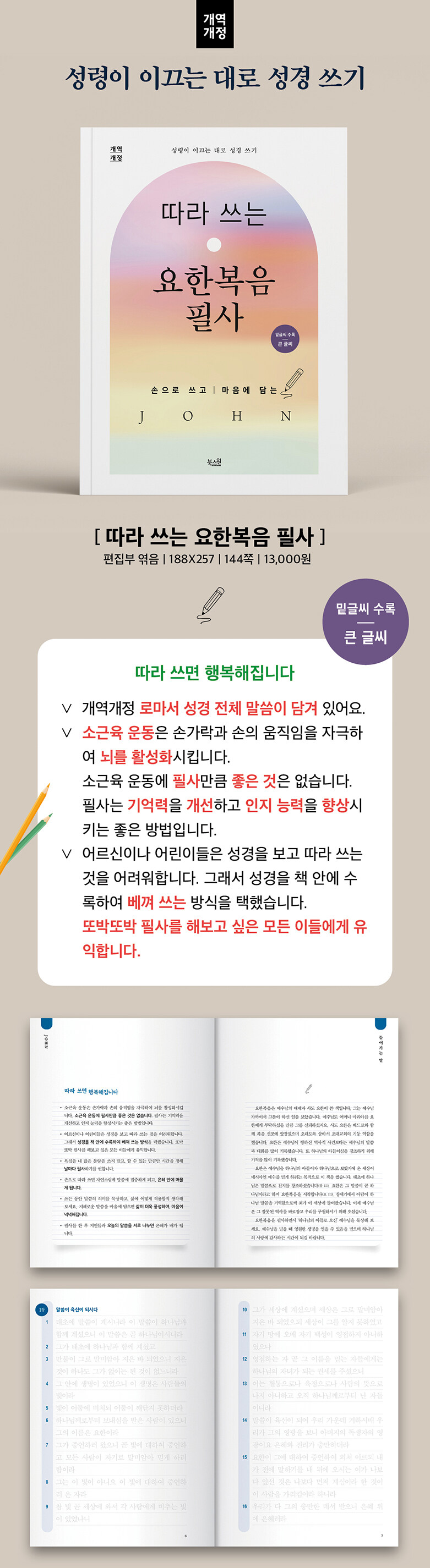 손가락과 손의 움직임을 활용한 필사는 소근육을 자극해 뇌를 활성화하고, 기억력과 인지 능력 향상에 도움을 준다. 성경을 책 안에 수록해 그대로 따라 쓰는 방식으로, 어르신과 어린이도 부담 없이 또박또박 필사할 수 있도록 구성했다.