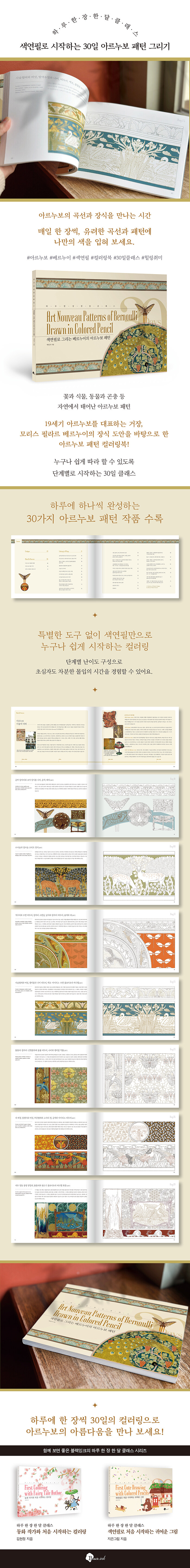 아르누보 스타일과 아름다운 패턴에 관심 있는 독자를 위해 하루 한 장, 30일 동안 완성하는 색연필 컬러링북으로 구성했다. 19세기 아르누보를 대표하는 디자이너 모리스 필라르 베르누이의 장식 도안 가운데 곡선과 구조의 유려함이 잘 드러나는 작품 30점을 선별해 하루 한 장씩 완성하도록 했다. 자연에서 얻은 식물과 동물 모티프를 곡선과 리듬으로 재해석한 베르누이의 패턴을 통해 아르누보 장식미술의 핵심을 만난다.