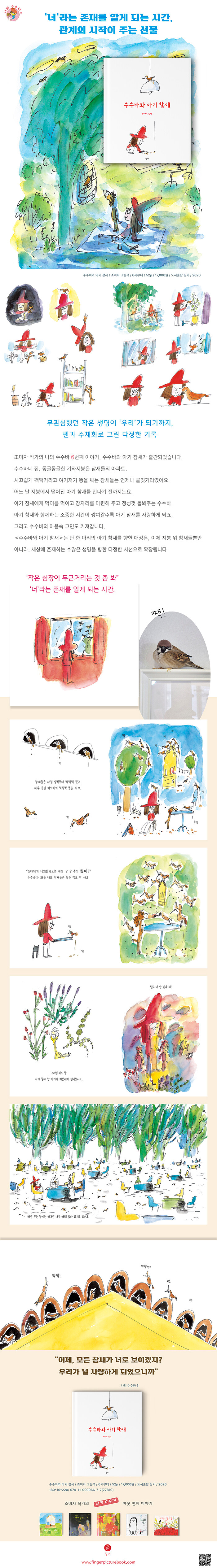 펜과 수채화로 그린 다정한 기록조미자 작가의 나의 수수바 6번째 이야기, 수수바와 아기 참새가 출간되었습니다.