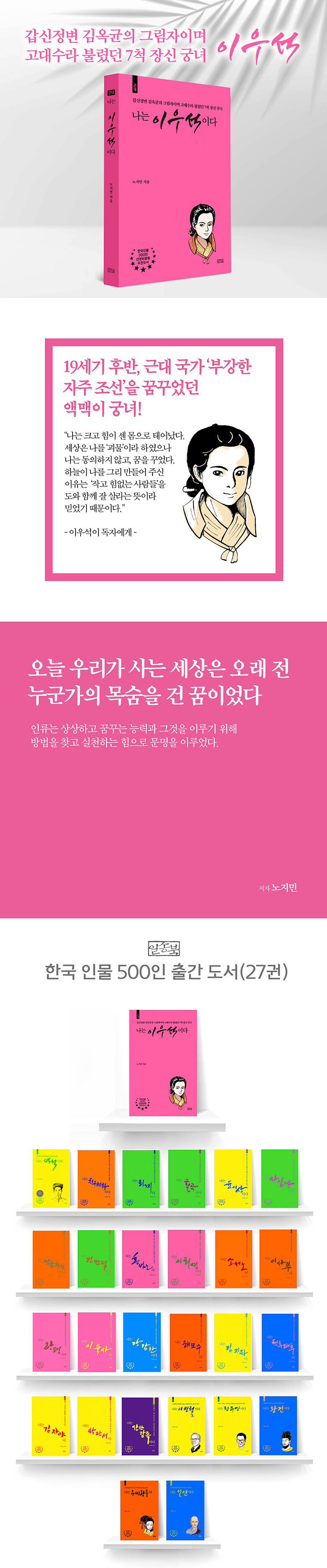 ‘한국 인물 500’ 발간 현황‘일송북은 ‘한국 인물 500’을 5백 권 예정으로 고대, 중세, 근세, 근대, 현대, 단체·분야별로 기획하여 순차적으로 펴내고 있습니다. 그동안 『나는 치우천황이다』(이경철), 『나는 사임당이다』(이순원), 『나는 퇴계다』(박상하), 『나는 율곡이다』(박상하), 『나는 백석이다』(이동순), 『나는 윤이상이다』(박선욱),『나는 이회영이다』(이덕일), 『나는 홍범도다』(이동순), 『나는 단군왕검이다』(박선식), 『나는 김만덕이다』(박상하), 『나는 소서노다』(윤선미), 『나는 이사부다』(김문주), 『나는 왕평이다』(이동순), 『나는 이육사다』(고은주), 『나는 강감찬이다』(박선욱),『 나는 해모수다』(윤명철), 『나는 김지하다』(이경철), 『나는 박완서다』(이경식), 『나는 김자야다』(이동순), 『나는 천추태후다』(윤선미), 『나는 삼한갑족이다』(박상하), 『나는 이병철이다』(박상하), 『나는 정주영이다』(박상하), 『나는 왕건이다』(박선욱), 『나는 일연이다』(이종문), 『나는 우씨왕후다』(윤선미) 등 26권을 선보여 언론과 독자들의 큰 호응을 얻었습니다. 금번에는 『나는 이우석이다』(노지민)를 내보내게 되어, 갑신정변의 주역이었던 김옥균의 그림자, 고대수라고 불리웠던 7척 장신의 궁녀 이우석을 국내에 첫 번째로 알리는 계기를 마련하게 되었습니다. 이로써 ‘한국인물 500’ 총서는 총27권을 발간하게 되었습니다.