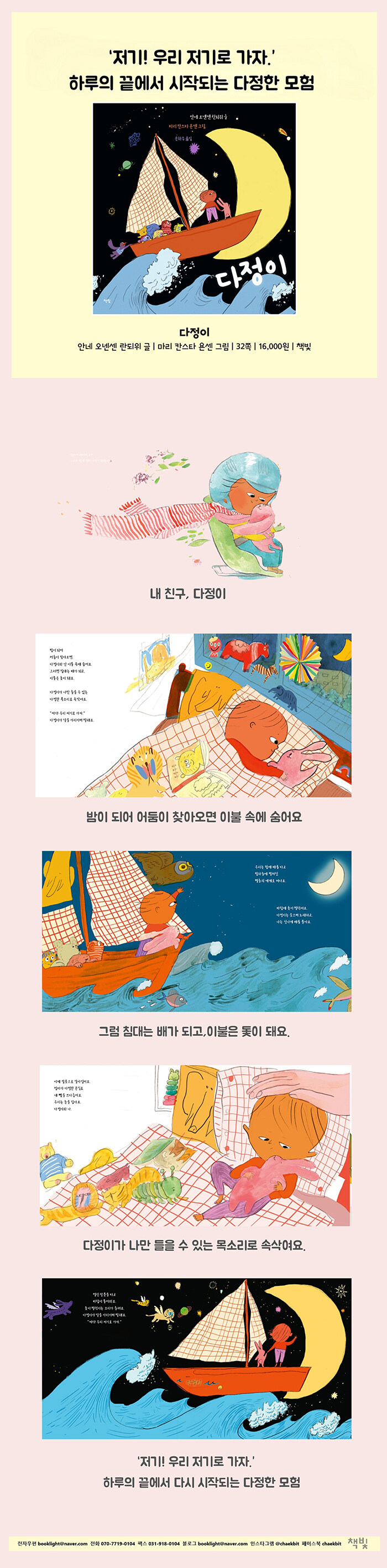 밤이 되어 어둠이 찾아오면 아이는 다정이와 함께 이불 속에 숨는다. 그러면 침대는 배가 되고, 이불은 돛이 된다. 조용히 속삭이는 다정이의 목소리는 아이만 들을 수 있는 비밀의 언어다. 아이는 다정이와 함께 배를 타고 신나게 별들의 세계를 탐험한다. 하지만 아침이 오면 배는 다시 침대가 되고, 돛은 다시 이불이 되며 바쁜 하루가 시작된다. 유치원에 가면 다정이는 가방 속에서 아이를 조용히 기다려야 한다. 낮잠 시간이 되어서야 다시 만난 다정이는 귓속말로 소곤소곤 이야기를 나누며, 아이의 마음을 다정하게 어루만진다.