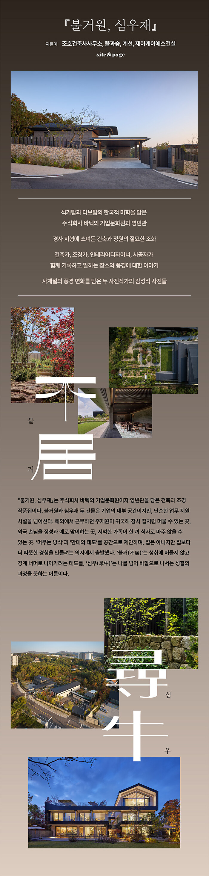 기업문화원이자 영빈관으로 지어진 불거원과 심우재를 건축과 조경, 1년의 사진 기록으로 담았다. 조호건축사사무소 설계를 중심으로 여러 주체가 완성한 두 공간은 업무 시설을 넘어 머무름과 환대의 태도를 제안한다. 성취에 머물지 않는 불거와 성찰의 여정을 뜻하는 심우라는 이름은 집보다 따뜻한 경험을 향한 의지를 드러낸다.