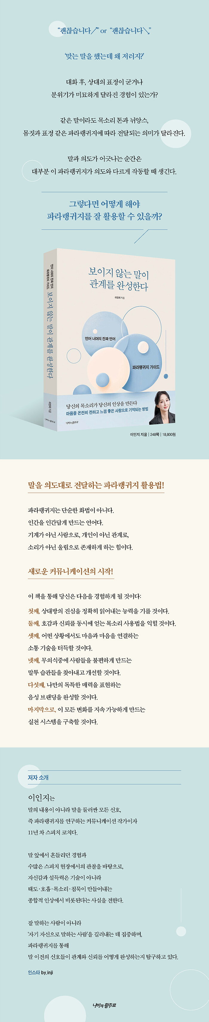 이 책은 단순한 화술서나 스피치 기법서가 아니다. 소통의 감도를 높이고, 타인과 나 사이의 감정적 연결고리를 이해하는 감각적 성장서다. 우리는 이미 말의 내용보다 말의 결이 더 중요한 시대에 살고 있다. 이 책을 통해 새로운 커뮤니케이션의 언어를 익히게 될 것이다.