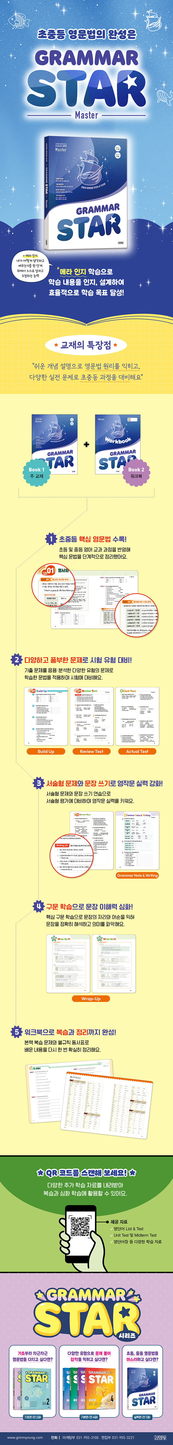 아이들이 영어 학습에 부담을 느끼지 않고 흥미를 가질 수 있도록 다양한 영어 학습 방식을 연구해 왔다. 이러한 연구를 바탕으로 초중등 학습자가 핵심 문법을 체계적으로 익힐 수 있는 『Grammar Star 그래머 스타』 시리즈를 출간하였다.