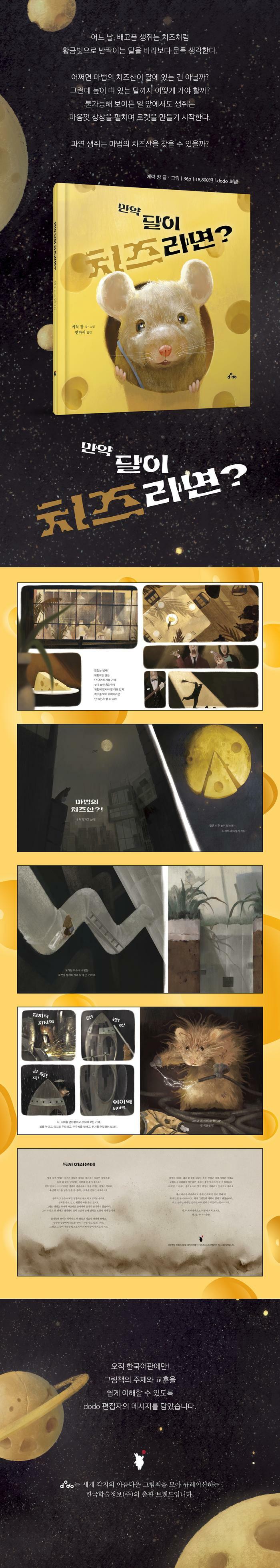『만약 달이 치즈라면?』은 치즈를 찾기 위해 떠나는 생쥐의 엉뚱하고 무모한 모험을 따라가는 그림책이다. 우연히 치즈를 닮은 달을 본 생쥐의 엉뚱한 상상은 하나의 꿈이 되고, 그 꿈은 우주를 향해 떠나는 모험으로 이어진다. 불가능해 보이는 일 앞에서도 상상을 멈추지 않는 마음과, 모험을 두려워하지 않고 끝까지 포기하지 않는 용기를 보여준다. 결과보다 과정을, 도착보다 출발의 순간을 소중히 그려내며 꿈을 꾸는 모든 이들에게 응원을 건넨다.
