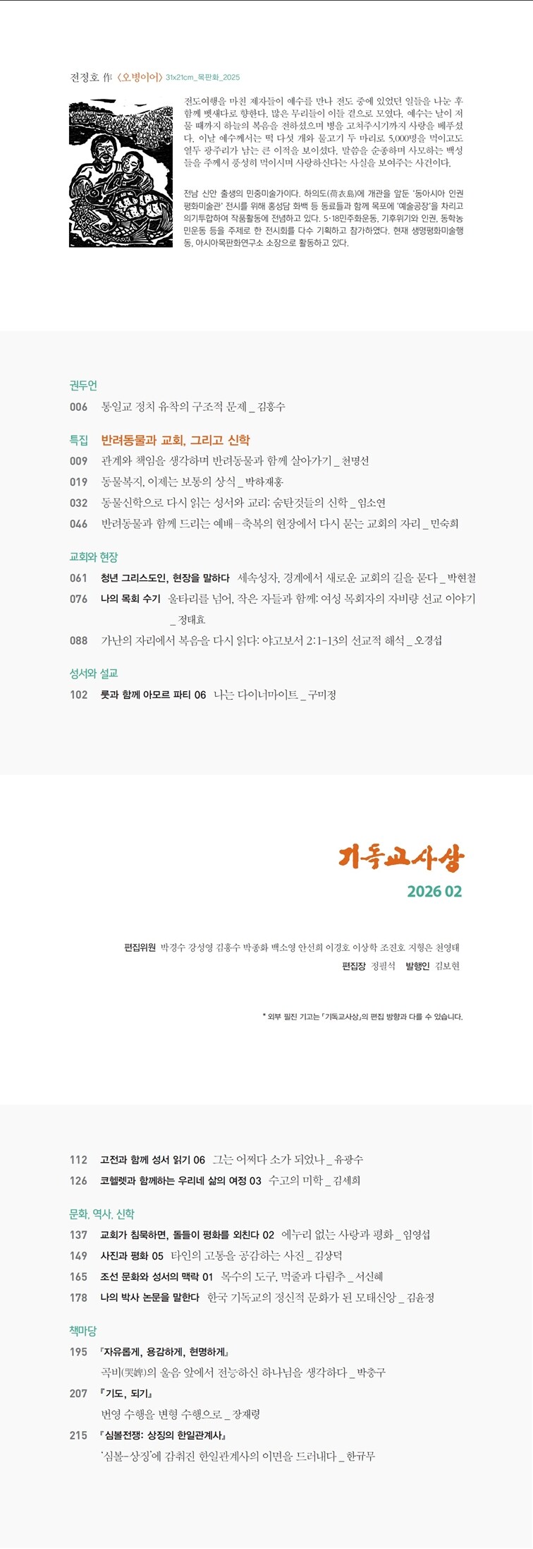 2월호 특집 반려동물과 교회, 그리고 신학이번 특집은 반려동물을 둘러싼 사회적 변화 속에서 인간과 동물의 관계가 신앙과 교회의 책임을 어떻게 다시 묻고 있는지를 다룬다. 반려 관계의 공동체적 책임, 동물복지의 상식화, 동물신학을 통한 성서와 교리의 재독해, 반려동물과 함께 드리는 예배의 현장은 이 문제를 각기 다른 차원에서 비추고 있다. 교회는 변화하는 생명 감수성 앞에서 어디까지 응답할 수 있는가. 이 특집은 반려동물이라는 구체적 현실을 통해 교회의 돌봄, 환대, 축복의 경계를 성찰하고자 한다.