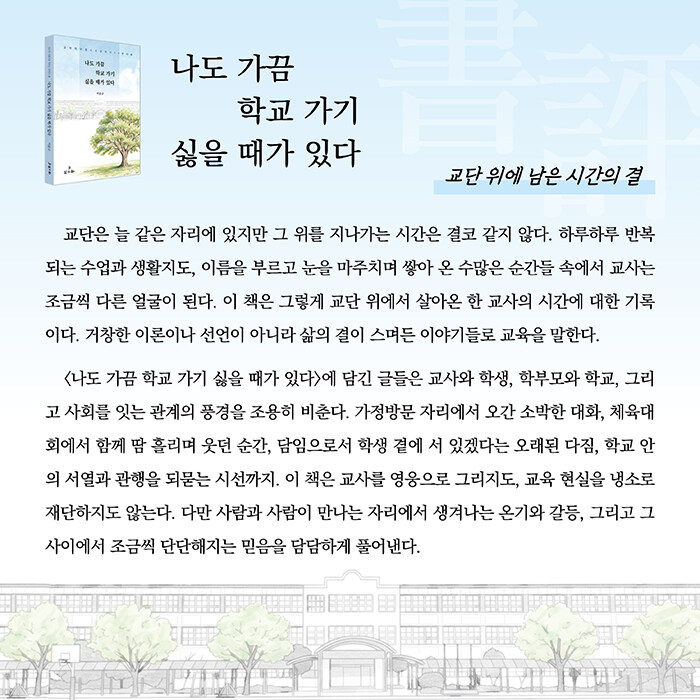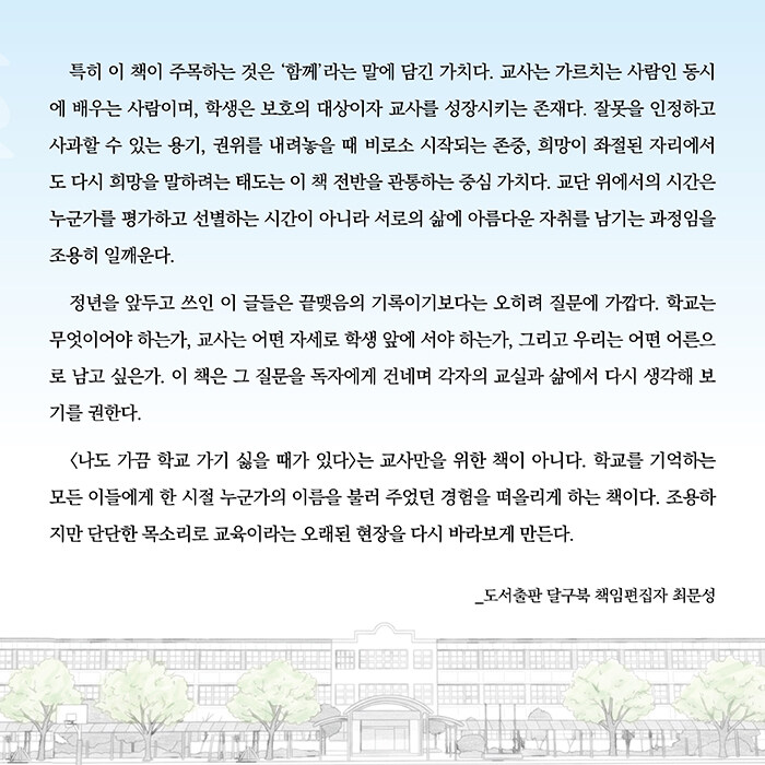 “34년간 한 학교에서 교단을 지켜 온 교사의 시간 속에는 어떤 이야기들이 담겨 있을까?”<나도 가끔 학교 가기 싫을 때가 있다>는 1992년부터 2025년까지 지방의 한 사립 고등학교에서 학생들과 함께 웃고 고민하며 걸어온 한 교사의 기록이다. 교사의 꽃이라 불리는 담임의 시간에서부터 학생과의 인연, 학교 안팎에서 더 나은 교육을 고민하며 내어 온 목소리까지, 교단 위의 소소한 일상과 교육 현장의 현실이 꾸밈없이 담겨 있다.