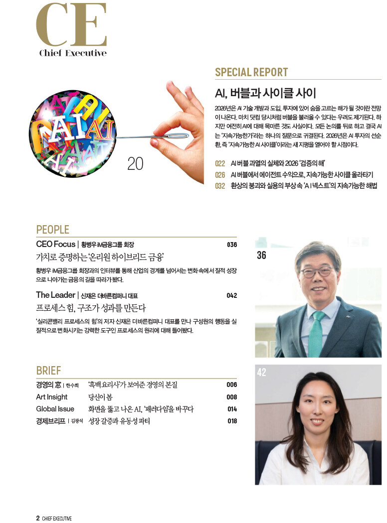 2026년은 AI 기술 개발과 도입, 투자에 있어 숨을 고르는 해가 될 것이란 전망 이 나온다. 마치 닷컴 당시처럼 버블을 불러올 수 있다는 우려도 제기된다. 하 지만 여전히 AI에 대해 목마른 것도 사실이다. 모든 논의를 뒤로 하고 결국 AI 는 ‘지속가능한가’라는 하나의 질문으로 귀결된다. 2026년은 AI 투자의 선순 환, 즉 ‘지속가능한 AI 사이클’이라는 새 지평을 열어야 할 시점이다.