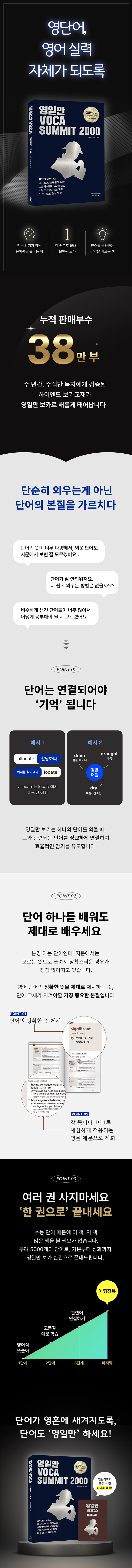 사실 단어책 한 권을 끝까지 보는 것만 해도 많은 노력이 필요합니다. 단어책을 몇 권으로 나누어 단계별로 독파하라는 것은 현실적이지 않습니다. 『영일만 보카』는 단 한 권으로 수능 기본 수준의 어휘와 심화 어휘까지 정복할 수 있도록, 더 많은 어휘를 한 권에 담았습니다. 2000여 개의 표제어와 3000여 개의 연관어로 단어의 기본부터 심화까지 이 한 권으로 끝내세요!