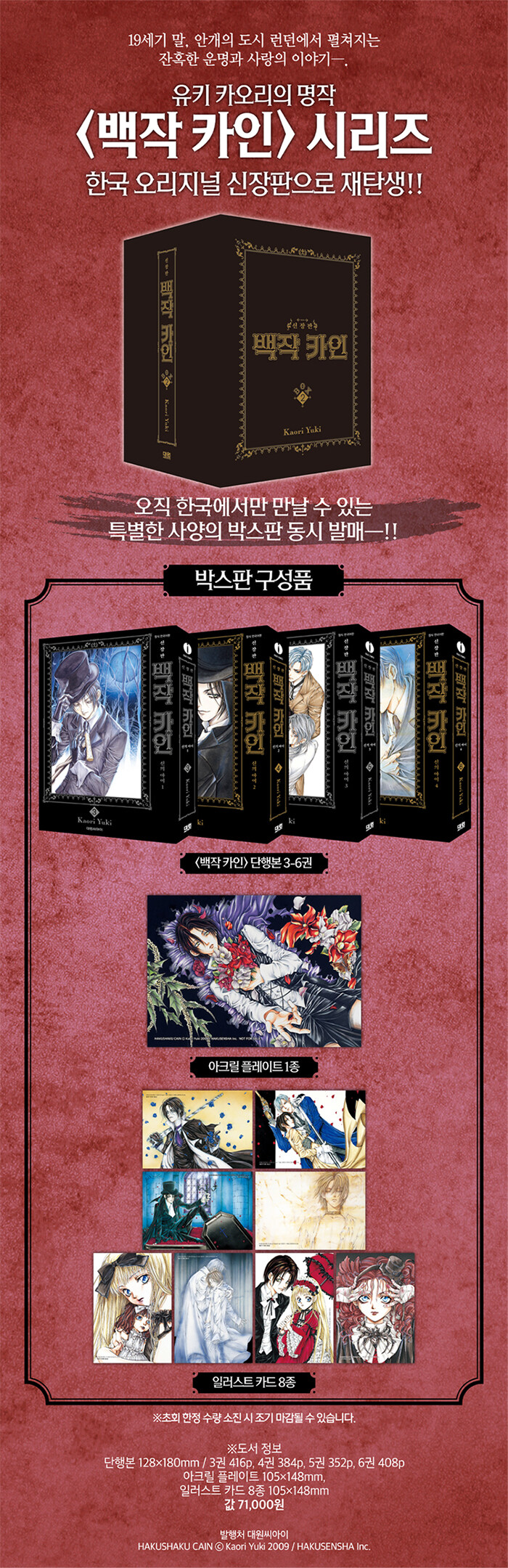 유키 카오리 작가의 명작 <백작 카인> 시리즈의 새로운 탄생. 발매 당시 큰 사랑을 받았던 일러스트를 사용한 특전이 담긴 박스판. 초기 시리즈로부터 7년이란 시간에 걸쳐 발표된 '신의 아이' 편이 드디어 시작된다. 19세기 후반, 빅토리아 왕조 시대의 런던을 배경으로 펼쳐지는 백작 카인과 집사 리프의 이야기가 펼쳐진다.
