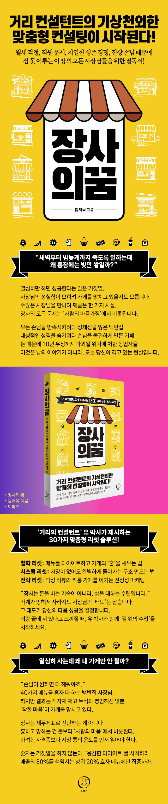 ‘장사의 꿈’을 찾아 떠난 30가게 컨설팅 현장 기록!『장사의 꿈』은 생존과 성공의 비결을 묻는 시대에, ‘장사의 즐거움’을 찾아 떠난 두 남자의 생생한 경영 컨설팅 현장을 담은 책이다.