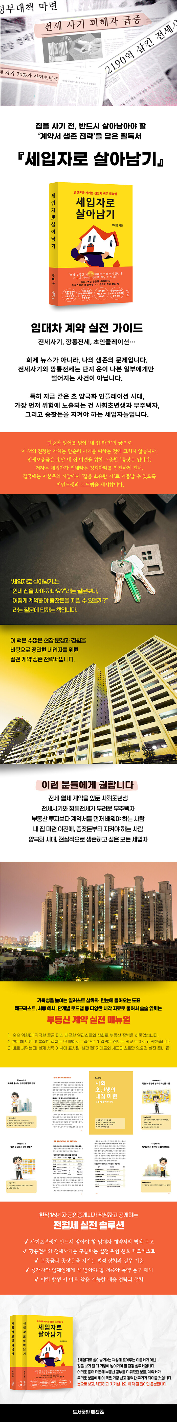 전세사기와 깡통전세로부터 내 보증금을 지키는 실전 매뉴얼!부동산 계약은 인생에서 가장 큰 거래 중 하나입니다. 하지만 정작 학교에서도, 가정에서도 제대로 배운 적이 없습니다. 그래서 많은 사람들이 준비 없이 계약을 맺고, 전세사기와 깡통전세의 피해를 입곤 합니다.이 책은 16년 경력의 현직 공인중개사인 저자가 자신의 실패와 성공 경험을 바탕으로 집필한 전월세 계약 실전 가이드입니다. 전세사기 유형부터 안전한 계약 체결법, 보증보험 가입, 등기부등본 해석, 임차인 권리 보호까지 전월세 계약의 모든 것을 담았습니다.특히 계약 전 체크리스트, 특약 작성 예시, 사기 예방 시뮬레이션 등 실무에 바로 적용할 수 있는 실전 팁과 양식을 풍부하게 제공합니다. 사회 초년생, 신혼부부, 독립을 준비하는 모든 이들에게 필독서입니다