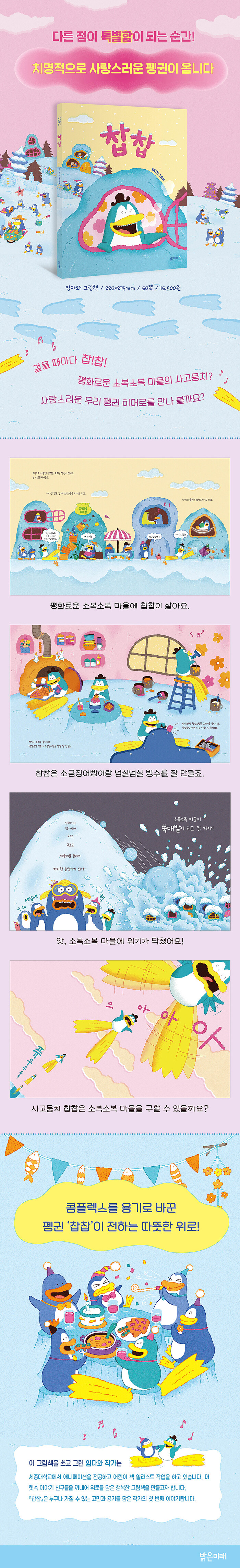 밝고 사랑스러운 펭귄 히어로, 찹찹!그림책 『찹찹』은 평화로운 펭귄 마을에서 남들보다 훨씬 커다란 발을 가진 펭귄 ‘찹찹’의 이야기다. 찹찹은 요리를 좋아하고 상냥한 마음씨를 지녔지만, 남들보다 유난히 큰 발 때문에 본의 아니게 ‘사고뭉치’로 통한다. 길거리의 화분을 차거나 가게 물건을 넘어뜨리기 일쑤고, 친구들과 수영장에서 놀 때면 물을 모두 넘치게 만들기도 한다. 찹찹은 자신의 커다란 발이 창피하고 속상하다. 그런데 마을에 커다란 위기가 닥치자 찹찹은 자신의 큰 발로 위기를 막아 내려고 나선다.