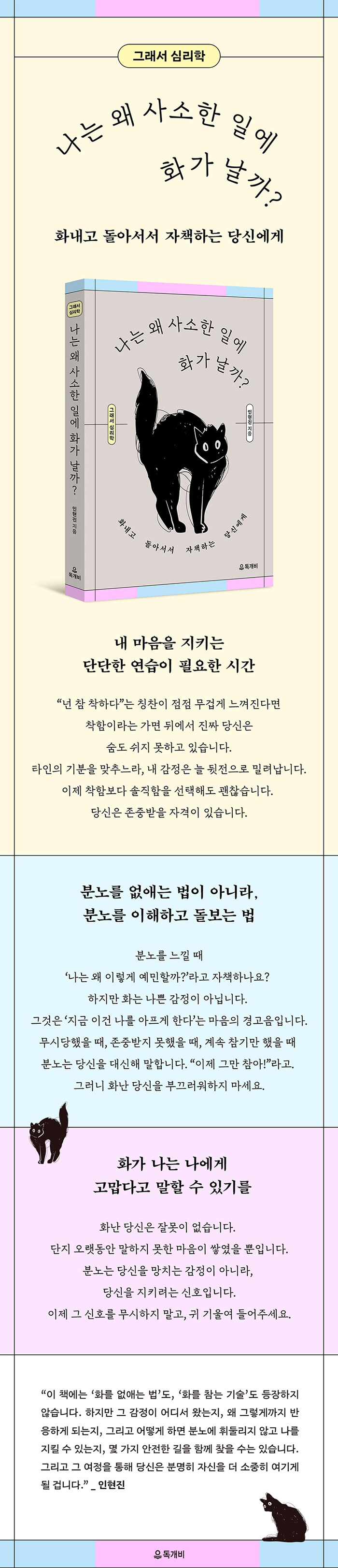 ▶ 참을 만큼 참다가, 결국 사소한 일에 터지는 이유우리는 어릴 때부터 화를 참는 것이 미덕이라고 배워왔습니다. “괜찮다”라고 말하는 것이 어른스러운 태도라고 여겼습니다. 하지만 억눌린 감정은 사라지지 않습니다. 작은 불만을 삼키고, 서운함을 숨기고, 억울함을 묻어두다 보면 어느 순간 댐이 무너지듯 폭발하게 됩니다. 그것도 가장 사소해 보이는 순간에 말입니다. 이 책은 우리가 ‘별것도 아닌 일’에 화를 내는 진짜 이유를 들여다봅니다. 하루 종일 참아온 감정들이 쌓여 있다가, 마지막 한 방울에 넘쳐버리는 것처럼 분노는 갑자기 생기는 게 아닙니다. 오랫동안 말하지 못한 감정의 총합이 분노라는 이름으로 드러날 뿐입니다. 저자는 심리상담사로서 만난 수많은 사람의 이야기를 통해, 분노 이면에 숨겨진 진짜 감정을 들여다보도록 해줍니다.