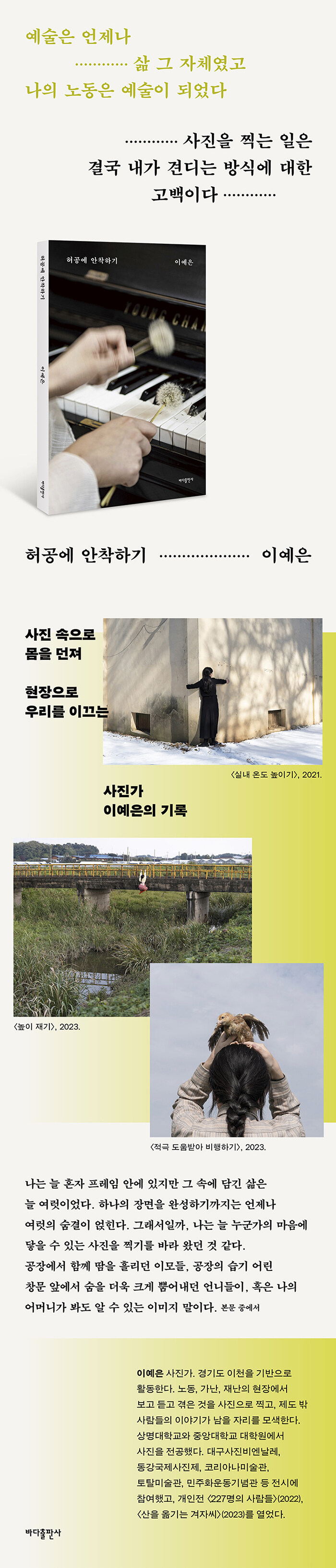 “자꾸만 사진 이후를 상상하게 된다”민들레로 피아노 연주하기, 티백으로 바다 우리기, 건물을 껴안아 실내 온도 높이기, 새의 도움을 받아 비행하기…. 이예은의 사진 속에서는 불가능한 일들이 또렷하게 상으로 남아 있다. 사진가 이예은은 삶을 은유적으로 표현하지만, 그가 바라본 삶은 꽤나 진실하다. 저자가 포착한 우리 사회에는 수많은 선이 있다. 정규직과 비정규직, 서울과 비수도권, 혹은 노동과 예술, 생계와 생활. 어디에든 선을 그을 수 있으며, 누구나 선을 그을 수 있는 사회이다. 그러면서도 사회는 이 선을 넘는 자들을 경계한다. 저자는 그 많은 선과 불가능을 부정하지 않는다. 불가능의 주체자로서 그 선 앞에서 새로운 가능성을 모색한다. 살아 있음 그 자체로 삶에는 수많은 가능성이 존재한다는 믿음이 이예은의 생각에 뿌리를 깊게 내렸고, 이는 그의 사진에 자연스럽게 드러난다.