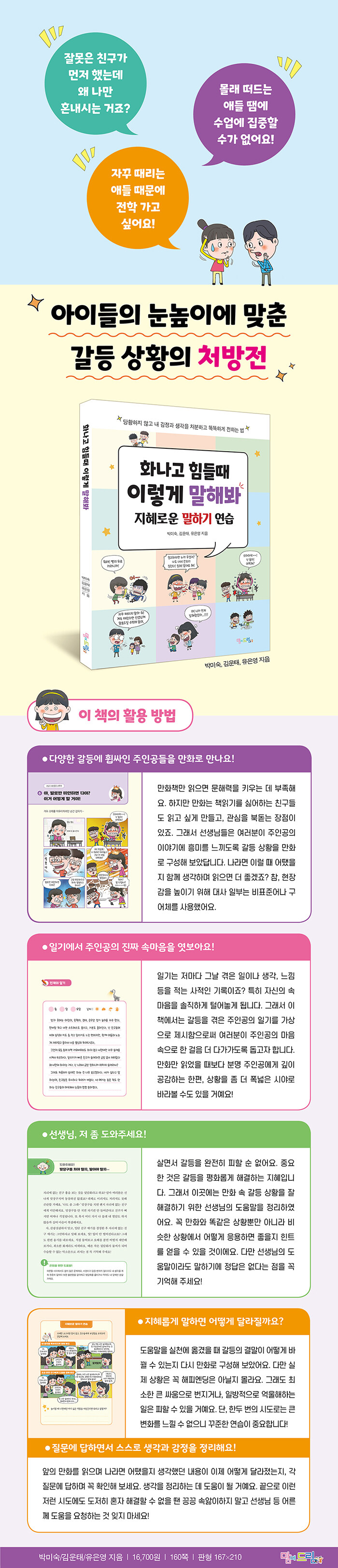 어른들도 작은 소통 문제가 씨앗이 되어 돌이킬 수 없는 갈등에 휩싸이곤 한다. 하물며 어린이는 자신과 타인의 복잡미묘한 감정을 헤아려 차분하고 조리 있게 말하기가 쉽지 않다. 때론 좋든 싫든 ‘헐’, ‘대박’과 같은 말만 되뇌기도 하는데, 이런 말들로 과연 자기 마음과 생각을 제대로 전달하고, 건강한 대인관계를 맺는 것이 가능할까? 어릴 때부터 말로 잘 소통하는 법을 익히는 것은 그만큼 중요하다.