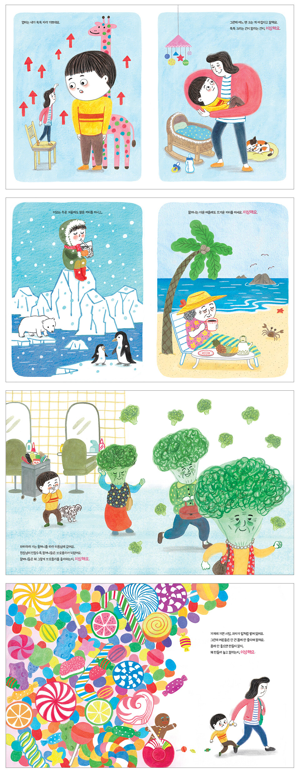 아이의 눈에는 이 모든 장면이 고개를 갸웃하게 합니다. 책은 그 순간마다 “이상해요.”라는 말을 덧붙이며, 어른의 세계를 아이의 논리로 다시 바라보게 합니다. 어른들의 관습적인 행동을 아이의 순수한 논리로 비틀어 보며 건강한 웃음을 자아내죠.