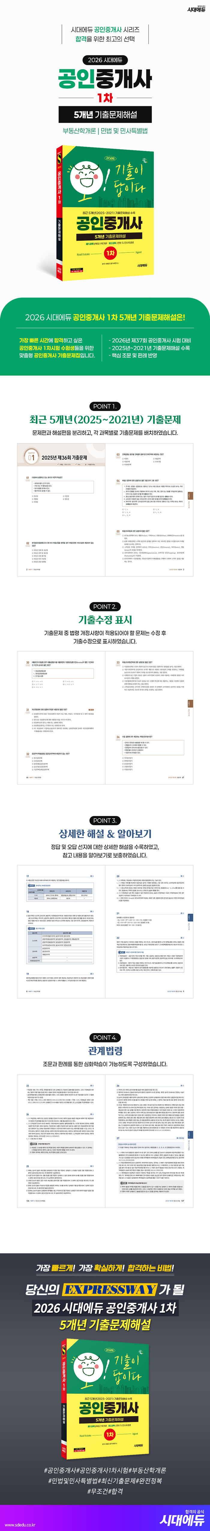 공인중개사는 토지?건물 등에 관한 매매, 교환 및 임대차 등의 중개를 전문으로 할 수 있는 법적 자격을 갖춘 자를 말합니다. 과거에는 일반중개인이 토지?건물 등의 중개업무를 담당하였으나, 1983년 부동산중개업법이 제정된 이후 공인중개사 중심의 허가제로 변하였고, 1985년 3월 27일 공인중개사 시험이 처음 시행된 이래로 현재에 이르고 있습니다. 공인중개사는 은퇴 후 노후를 대비하고자 하는 중?장년층부터 경력이 단절된 전업주부, 20~30대 청년들까지 다양한 상황의 사람들이 도전하는 시험이고, 시험이 점차 어려워지면서 합격의 문턱이 점점 더 높아지고 있는 추세입니다. 이에 시대에듀는 최근 5개년 기출문제를 통하여 최신의 기출유형을 집중적으로 파악하고, 상세한 해설과 함께 꼭 필요한 이론?판례만을 수록하여 효율적인 학습방향을 제시하고자 「2026 시대에듀 공인중개사 1차 5개년 기출문제해설」을 펴내었습니다. 본서가 공인중개사 시험에 도전하는 수험생에게 합격의 길잡이가 될 것을 확신하며, 본서로 학습하는 모든 수험생이 뜻하는 목표를 이루기를 진심으로 기원합니다.