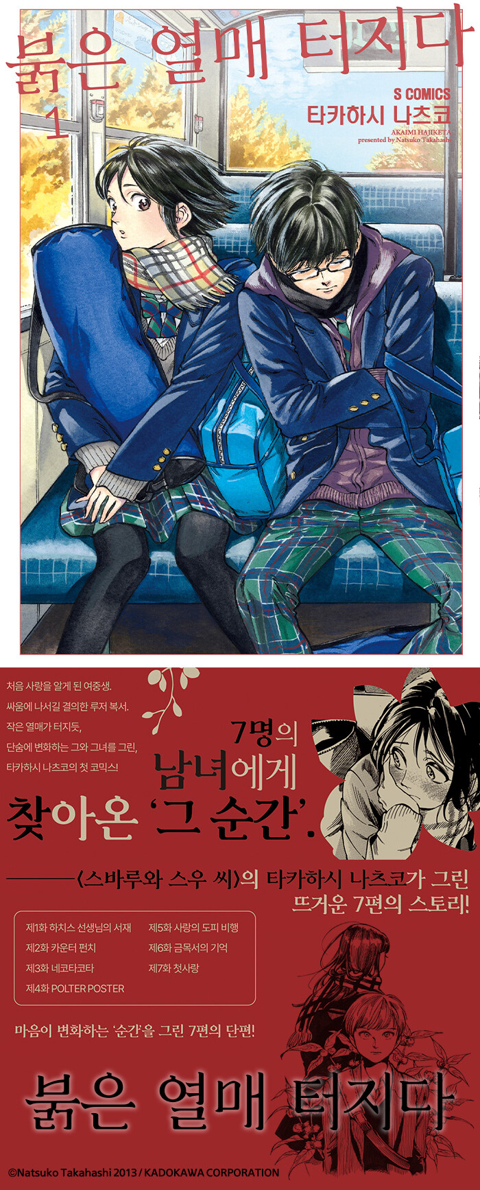 <스바루와 스우 씨>의 타카하시 나츠코가 그린 뜨거운 7편의 스토리. 처음 사랑을 알게 된 여중생. 싸움에 나서길 결의한 루저 복서. 작은 열매가 터지듯, 단숨에 변화하는 그와 그녀를 그린, 타카하시 나츠코의 첫 코믹스.