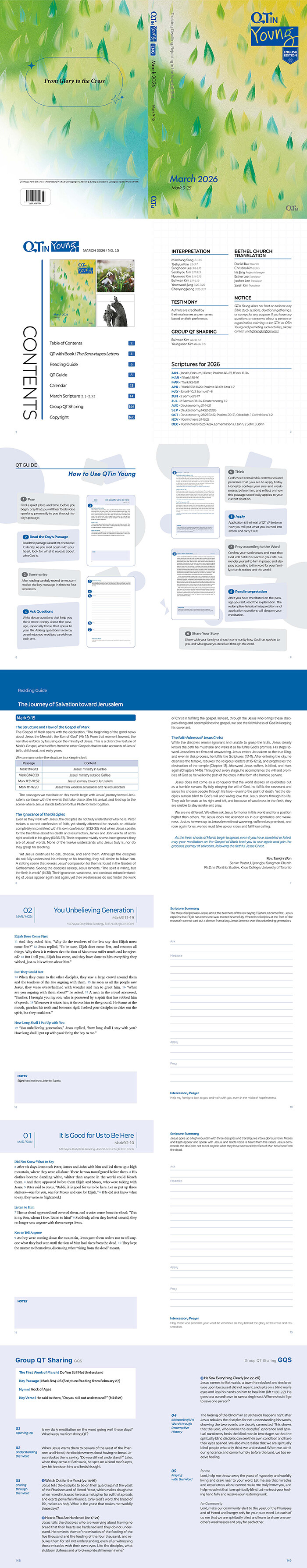 말씀대로 믿고 살고 누리는 《QTin Young》성경을 구속사적으로 읽기 원하고, 성경적 가치관으로 변화되기 원하는 청년층을 대상으로 합니다. 현재는 국내외 독자들에게 구속사적인 말씀묵상 운동을 전하고자 40여 명의 필진과 편집부가 섬기고 있습니다.